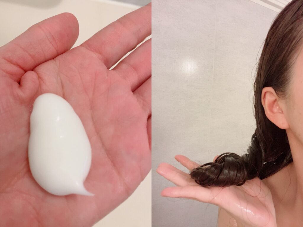 ヘアパックはクリームのような濃密テクスチャーで、毛先までスッと伸びて密着。