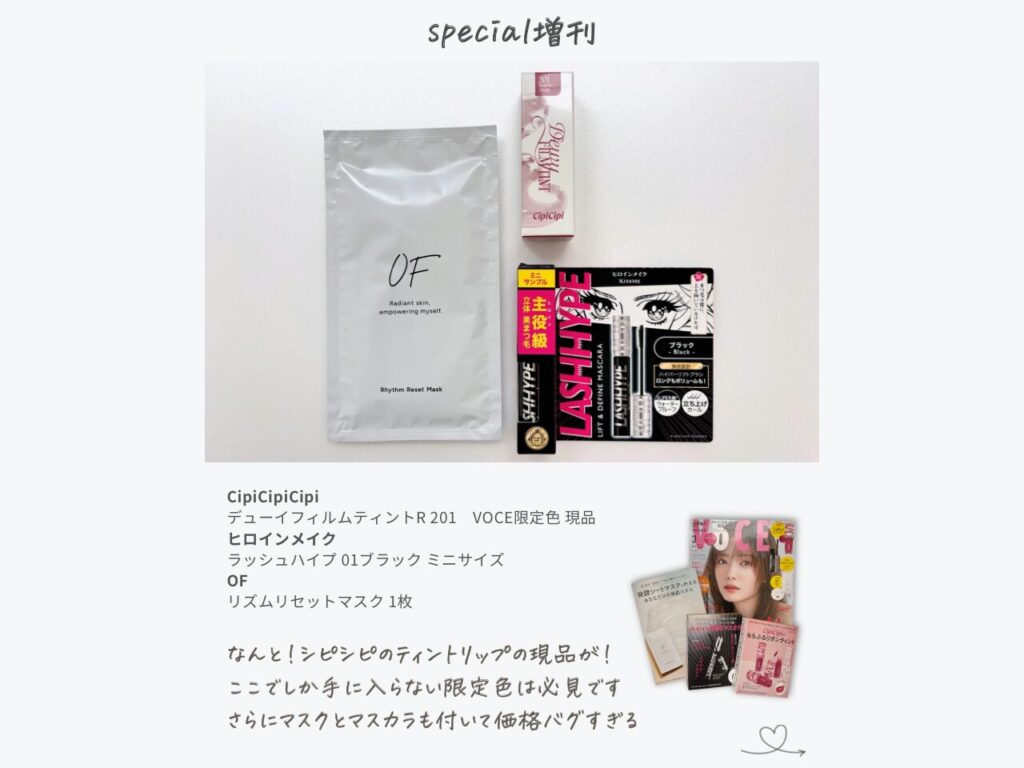 cipicipiのリップティント現品が付いてくるのに、OFのフェイスマスクとヒロインメイクのマスカラもセットになった価格バグ付録。